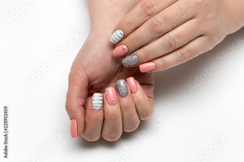 Pink Beige White Manicure With Silver Stripes Crystals Silver